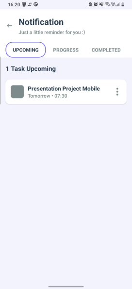 ๐ Notifikasi dengan 3 filter (upcoming, in progress, completed)