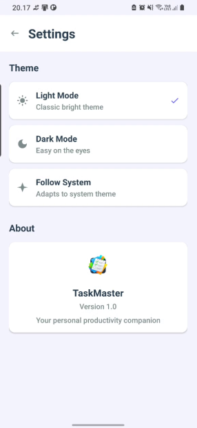 | Theme | AppCompatDelegate | Dark/Light mode implementation |